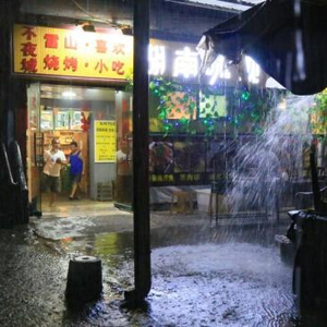 6月10日晚,贵州省雷山县遭受暴雨袭击。据贵州气象局预测,6月10日夜间发布暴雨黄色预警信号,在11日1时升级为红色预警。图为雷山民众在夜市中避雨。 中新社记者 贺俊怡 摄