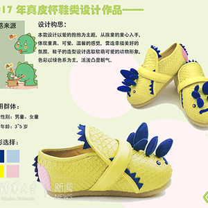 褚洪静在设计作品以“爱的抱抱”为主题,从孩童的童心入手,体现童真、可爱、温馨的感觉,营造幸福美好的氛围。鞋子的造型设计选取软萌可爱的动物形象,色彩以绿色系为主,用色俏皮,款式活泼,凸显朝气。此款设计最终获得童鞋金奖。