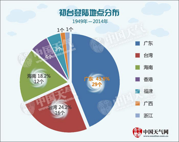 中国天气网数据帝根据1949-2014年的台风统计数据发现,66年当中有29个年份(相当于43.9%的概率),初台选择了广东,其次是台湾和海南。