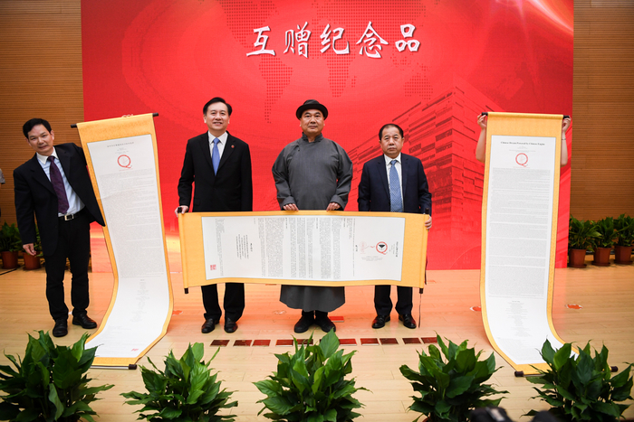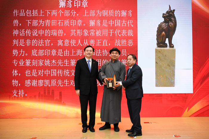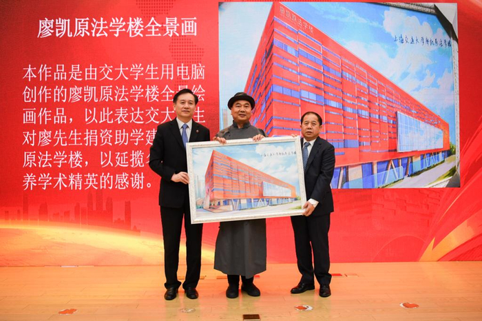 会上同时举行了凯原捐赠项目二期签约仪式。林忠钦和廖凯原签署了捐赠协议。廖凯原发表致辞,凯原法学院向其赠送了廖凯原法学楼全景图和法学院印章。