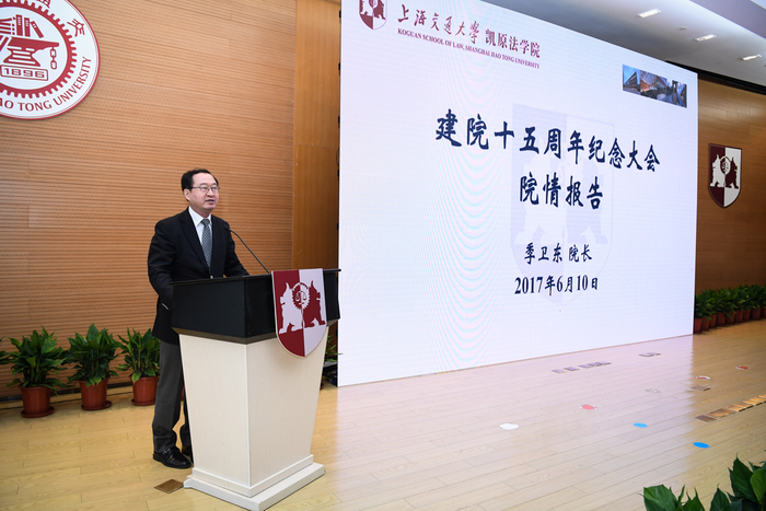 季卫东以《飞鸿踏雪泥》为题作发学院发展工作报告。2002年6月,上海交通大学成立法学院,掀开法学教育新的篇章。法学院成立15年来,人才培养质量不断提升,科研水平持续攀高,教职工人才队伍不断优化,国际化进程快速推进,学院文化和凝聚力建设不断加强,全院师生齐心协力、奋发图强,已使学院成为全国发展最快的法学院之一。自2008年冠名凯原法学院以后,学院坚持国际化主战略,探索法学教育改革新模式,推动问题导向的跨学科研究,着力于教学质量工程和凝聚力工程,搭建各种研究交流平台,始终保持了高速增长的态势,开始迈向法学院校第一方阵。自2012年起,在QS世界大学法学学科排行榜中连续六年进入世界百强。