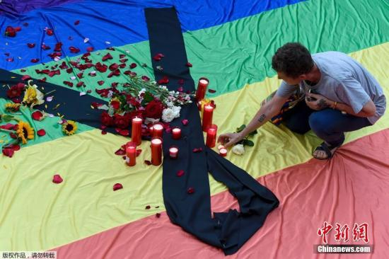 中新网6月13日电 综合报道,6月12日,美国奥兰多市夜总会枪击事件迎来一周年纪念日。当天,教堂钟声敲响49次,当地政府大楼挂起巨型彩虹旗帜,纪念袭击事件中的49名遇难者。