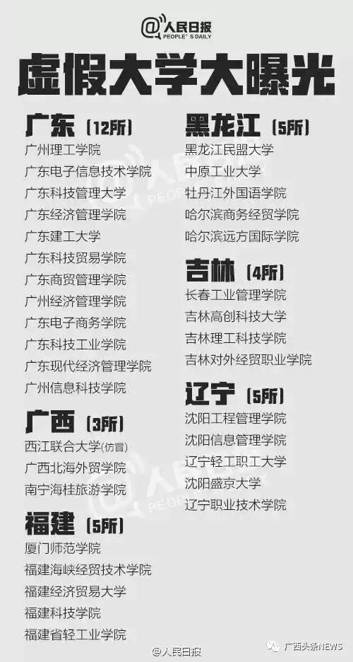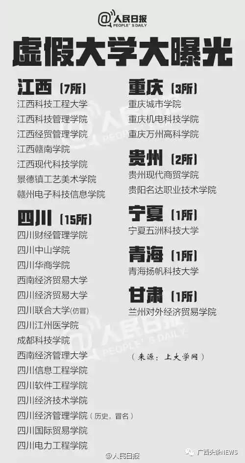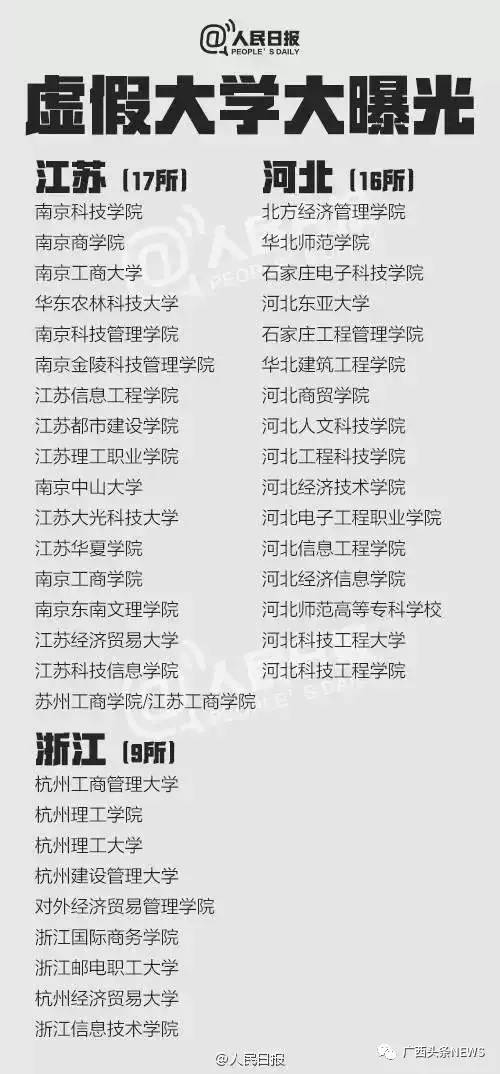 名单中,广西的3所“高校”分别是“西江联合大学”“广西北海外贸学院”“南宁海桂旅游学院”。