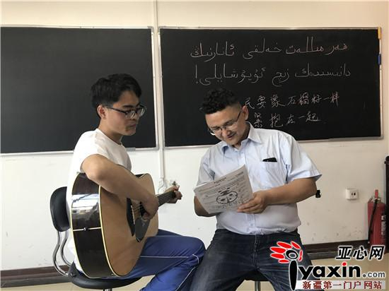 前不久,郑剑秋所在的学校开展歌唱比赛,他说:“在选择参赛歌曲时,我萌生了唱一首维吾尔语歌曲的想法。”郑剑秋在网上找到了维吾尔语版的《夜空中最亮的星》,恰好又会用吉他弹这首曲子,在培训中心老师的帮助下,郑剑秋将维吾尔语歌词读熟,有些发音较难的词汇熟读了至少上百遍。
