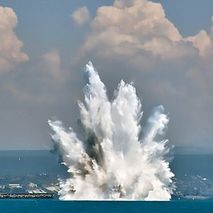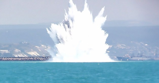引爆区域周围所有的海滩均被关闭,而潜水员们则需要顶着强风和潮水的压迫,做好安全引爆工作。在经过9小时的紧张准备之后,俄方派出了一艘机器潜艇引爆水雷。水雷爆炸后掀起一阵巨浪,白花花的海浪自海中翻腾而起,炸裂开来,似一块巨大的冰堆伫立水中,十分震撼。