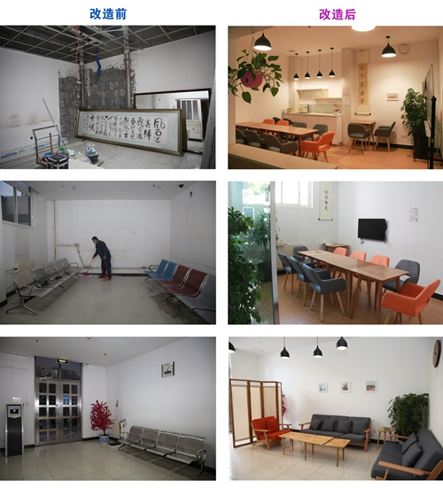 改造前后第四是自治共享、温馨实用。“大家空间”改造开始到全面完成以来,学区学生组织和社团类群体已经在此举行了10余场各类沙龙及文化公益活动。单是万柳学区的系列生活课堂就先后组织了职场美妆、红酒品鉴、色彩搭配、户外健身等沙龙活动;万柳学生联合会和师生党支部的成员在此举办了电子产品义诊活动;法硕联合会的同学组织毕业离校公益活动;更有同学在此举办小型音乐会及进行沟通交流等。值得一提的是“大家空间”的管理和使用由万柳联合会和师生联合党支部的党员同学们主动承担,从拟定使用说明到出台管理制度,再到对不文明现象的制止和良好风气的弘扬,党员同学自发排出轮值表在大厅醒目处张贴,遇到情况和问题,同学们只要联系到党员同学便会得到周到的解答或服务。