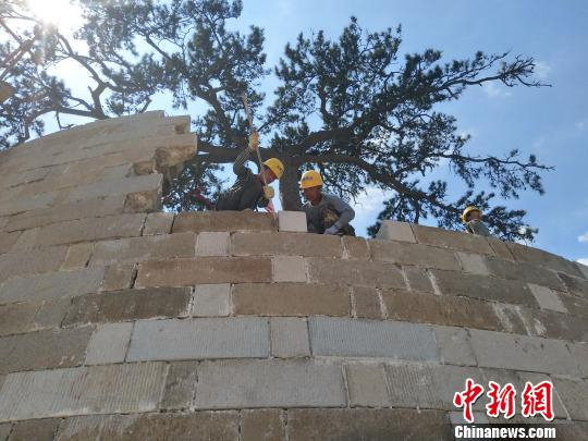 中新网记者在修缮现场看到,高约20米的点将台,由大小两个墩台组成,又称“子母台”,坐落在群山环抱之中的一片开阔地上,与山顶上遍布的长城敌楼(即城墙上御敌的城楼)遥遥相望。