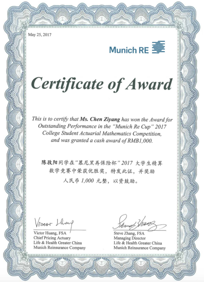 “慕尼黑再保险杯”大学生精算数学竞赛是一项由慕尼黑再保险公司寿险大中华区举办的国际性精算数学竞赛,2011年在北京举办首届竞赛,至今已发展成为颇具影响力的年度精算赛事。2017年共有来自国内外100多所院校的669名学生报名参加了本次竞赛。竞赛获奖者将被优先考虑入选慕再大中华区实习生计划,并有机会参加慕再举办的培训和夏令营。
