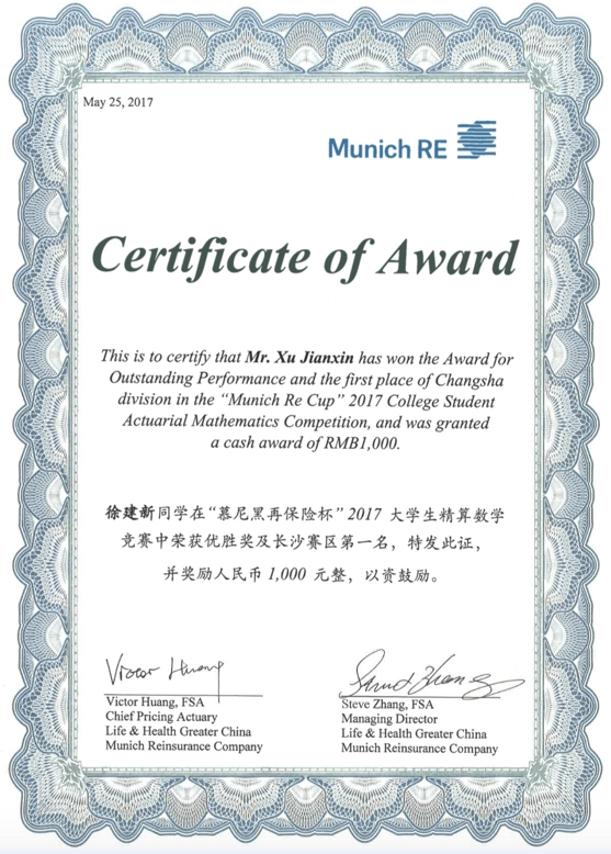 在近日举行的“慕尼黑再保险杯”2017大学生精算数学竞赛中,我校金融与统计学院学生徐建新、陈孜阳分获全国第五、第七的好成绩。