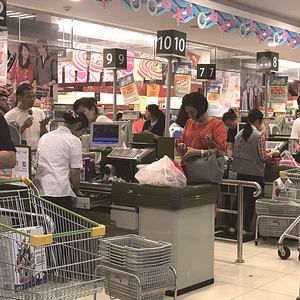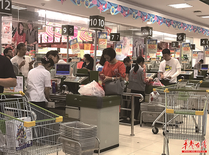 在了解了菜市场和小超市的塑料袋使用情况后,当天下午,记者陆续走访了位于湘雅路的家润多、蔡锷路的华润万家以及芙蓉中路的家乐福三个大型超市。在超市收银处,不少顾客在排队买单,“要购物袋吗?大的4毛,小的2毛!”的询问声也不时传来。