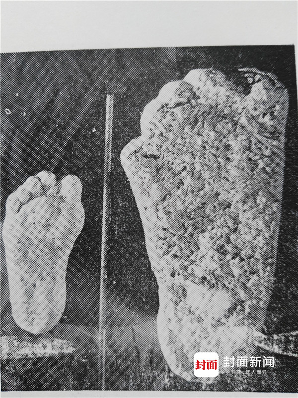 图为神农架枪刀山上发现的“野人脚印(右)与现代成年男子脚印模型比较。(图片均由湖北省野人考察研究会会长王善才提供)封面新闻-华西都市报记者 刁明康 武汉报道
