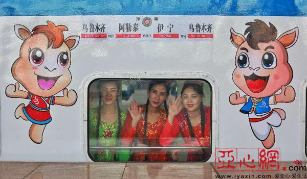在车站和列车上,以“沙漠之舟”骆驼为原型设计的吉祥物“新新”、“疆疆”随处可见,憨态可掬,萌翻了一众游客,纷纷合影留念。装扮一新的双层旅客列车上,由代表了新疆地域特色和瓜果飘香的蓝色、黄色、绿色和红色四种颜色组成的专列LOGO清晰醒目,头部是骆驼、下部是火车的造型,既代表坐着火车游新疆,速来,慢游,又体现出以骆驼为代表的古老丝绸之路,正在被奔驰的“铁龙”所替代,成为新丝绸之路经济带上新的动力。
