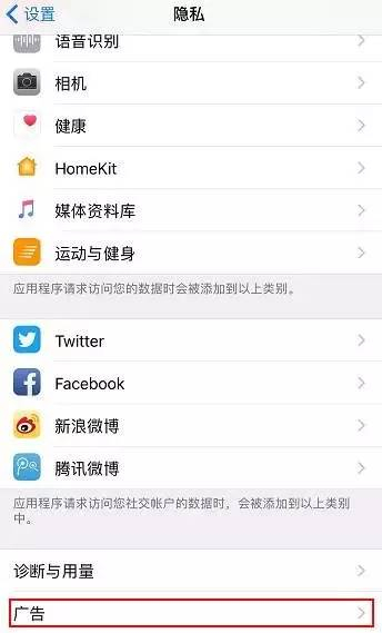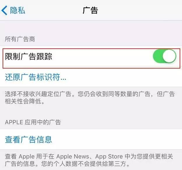 iPhone的广告追踪功能,可以根据用户的位置、关注内容、使用习惯等来显示更具指向性的广告。点击设置-隐私-广告-限制广告跟踪打开。