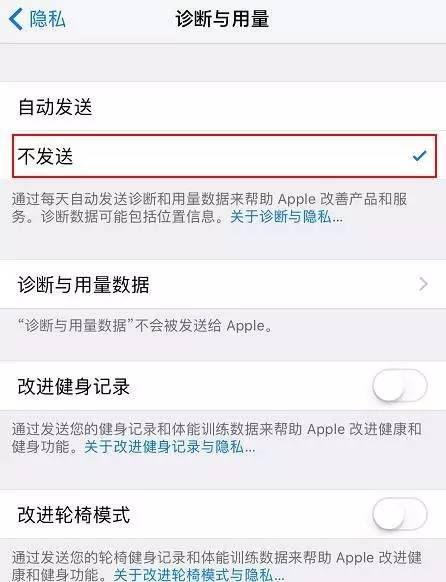 手机不时会弹出发送诊断与用量的提示,因为每天会通过自动发送诊断和用量数据来帮助Apple改善产品和服务。如果嫌烦可以点击设置-隐私-诊断与用量-不发送。