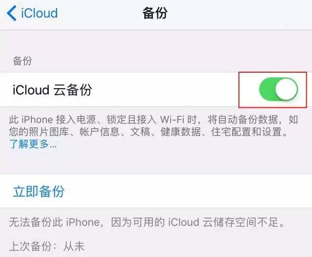 不时就会提示我iCloud云备份的提示信息,这时候我们设置-iCloud-备份-关闭云备份功能。