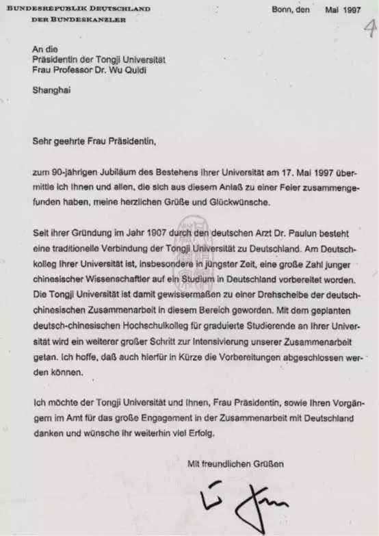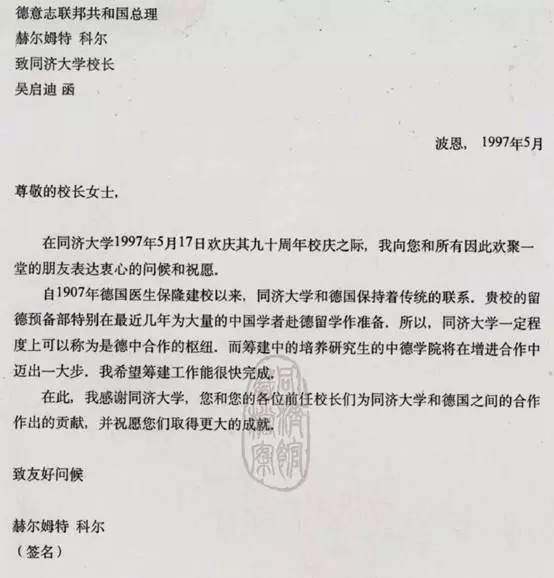 1997年,同济建校90周年前夕,科尔总理给时任同济校长吴启迪来信,祝贺我校90周年校庆。