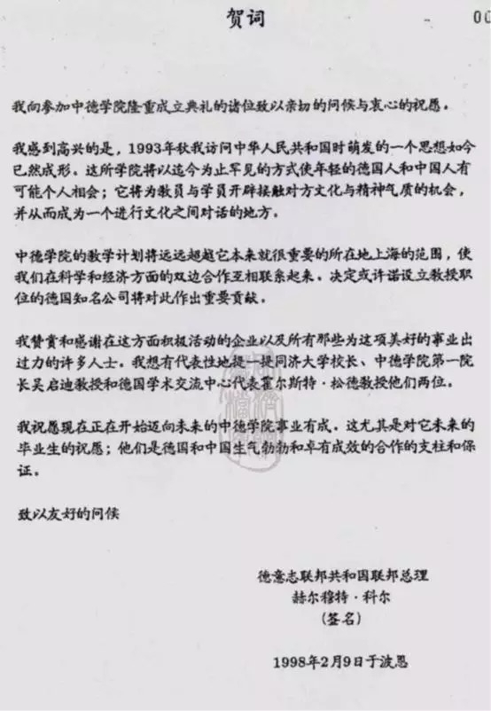 1998年,同济大学中德学院挂牌成立,科尔总理又发来贺信,由时任德国驻华大使赛康德宣读。(中译文)