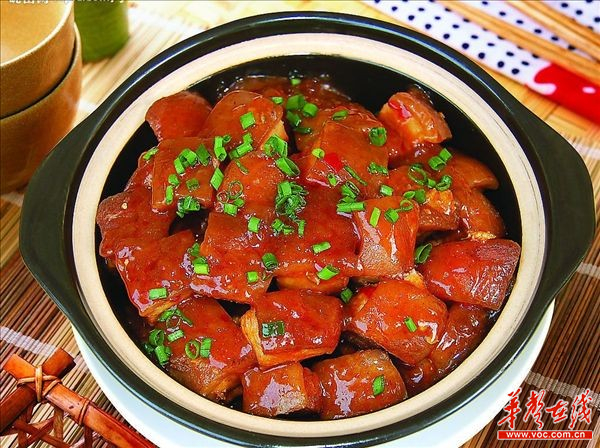 韶山最有特色的肉类菜要数毛氏红烧肉,要知道当年毛泽东也是最喜欢吃这道菜的,遍布全国各大城市的毛家餐馆都用红烧肉来作招牌菜,并美其名曰“毛氏红烧肉”。红烧肉是采用半瘦半肥的猪肉,切成匀称的切状,再用上等酱油加少量的糖烧制而成,色泽呈金黄,味道糖而不腻。