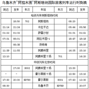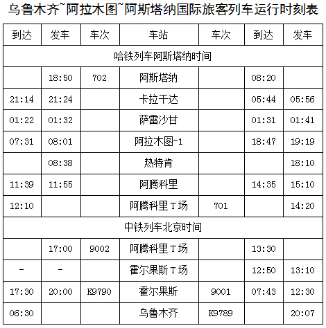 自2017年6月7日起,新疆铁路部门开行了首趟由乌鲁木齐始发经霍尔果斯口岸出境去往阿斯塔纳的国际联运旅客列车。列车自乌鲁木齐站发车车次为K9765次,在中方霍尔果斯站重新编组后,车次变更为9001次,经40分钟抵达哈方阿腾科里站,旅客在阿腾科里站换乘哈方车辆,车次再次变更为701次,列车经停阿拉木图、萨雷沙甘、卡拉干达等站,最终抵达阿斯塔纳。列车开行初期编组五辆,共设有180个旅客席位,全部由硬卧车组成。