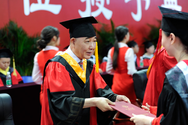 在激昂的乐曲声中,主席台前排就坐的校领导、院士、杰出教授、校学位评定委员会委员向博士、硕士学位获得者代表颁发了学位证书,扶正流苏,并与同学们亲切交谈,留下珍贵合影。