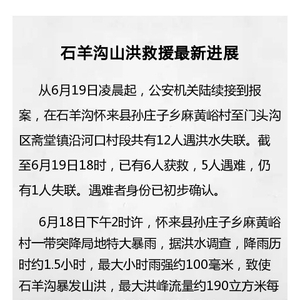 中国网6月20日讯 据北京市政府新闻办公室官方微博消息,从6月19日凌晨起,公安机关陆续接到报案,在石羊沟怀来县孙庄子乡麻黄峪村至门头沟区斋堂镇沿河口村段共有12人遇洪水失联。截至6月19日18时,已有6人获救,5人遇难,仍有1人失联。遇难者身份已初步确认。