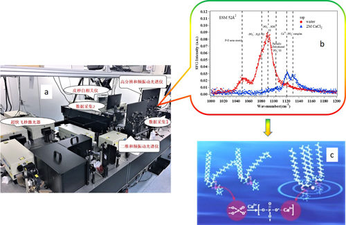 图:高分辨和频光谱实物图(a),高分辨和频振动光谱研究钙离子与鞘磷脂相互作用(b),钙离子与鞘磷脂之间相互作用机理图(c)。