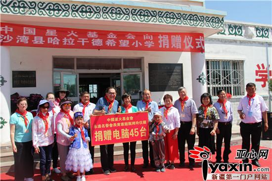 亚心网讯(通讯员 哈尼亚)6月20日上午,“中国星火基金会”周鸿生先生代表名誉会长黄宪懿与“中国星火基金会”名誉顾问邱瑞真女士、名誉会长冯耀漮先生等一行14人来到哈拉干德希望小学,为学校师生捐赠45台电脑、68名品学兼优生捐赠书包等。