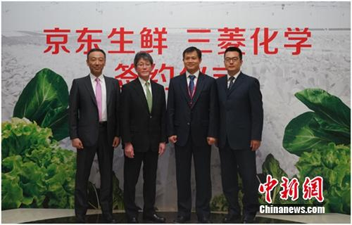 无锡菱阳生态农业设施科技有限公司荒井总经理(左1),日本三菱化学株式会社佐佐木常务(左2),京东集团副总裁、京东商城生鲜事业部总裁王笑松(右2),生鲜事业部重点项目部负责人张勇(右1)