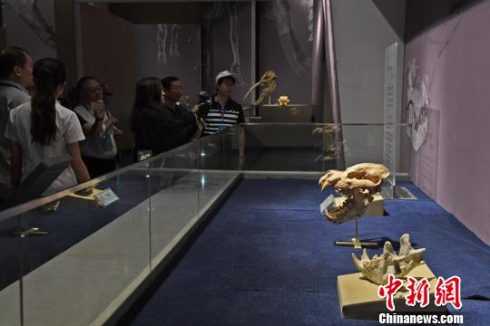 图为世界上最大的鬣狗“巨鬣狗”化石。 杨艳敏 摄