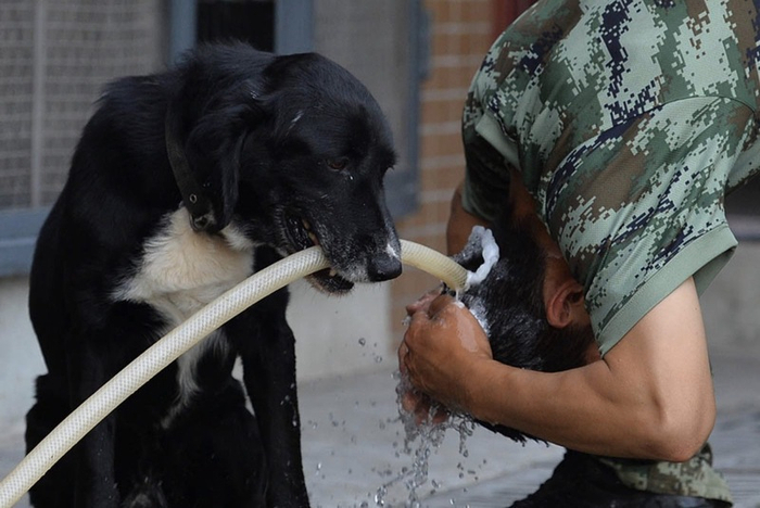 张滨滨就把冲凉的时间也用来陪伴“雷达”,于是就有了这张战友抓拍的网红照。