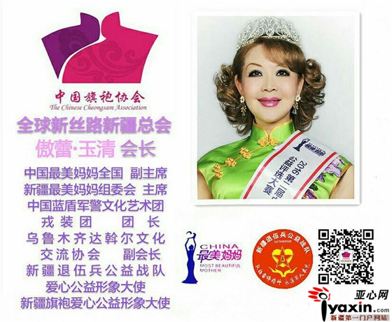 中国旗袍协会全球新丝路新疆总会2017年5月23日成立了,傲蕾·玉清会长表示:“作为新疆本土爱心公益人士在新疆推广中国传统文化,弘扬中华民族传统国粹,是我们应尽的责任和义务。感谢汪泉理事长的信任和重托,我应邀出任会长,一定不负众望,引领中国旗袍协会全球新丝路新疆总会全体旗袍佳丽们在中国旗袍协会汪泉理事长领导下,同心同德,共同弘扬中华传统文化,共同弘扬民族团结精神,共创中国旗袍协会辉煌的明天。