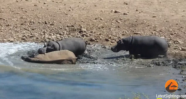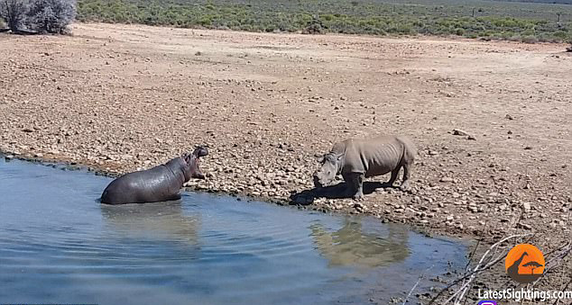 南非犀牛为争夺水源被河马按到水里淹死