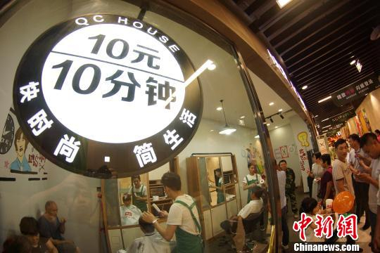 南昌一超市“快餐式”十元理发店受热捧 中国新闻网 2017.06.2318:51 关注 不少顾客在理发店前驻足停留。店主称,活动期间顾客可享受到五元理发的优惠。王昊阳 摄 一位老太太在理发。几分钟的时间,五元钱的花费,加上理发师娴熟的技术,让老太太感到很满意。 王昊阳 摄 店内挤满等待理发的顾客。十元钱,十分钟的理发成本,吸引大量工薪阶层关注。 王昊阳 摄6月23日,在南昌市西湖区万达广场一超市内,十余平方米的空间内挤满了正在等待理发的多位老人和中年人。这家新推出“快餐式”理发理念的店主称,“十分钟,十元钱”这样的消费成本和服务模式,受到不少中老年人和工薪阶层的欢迎,开业不到一小时,已有20多个顾客排队取号。