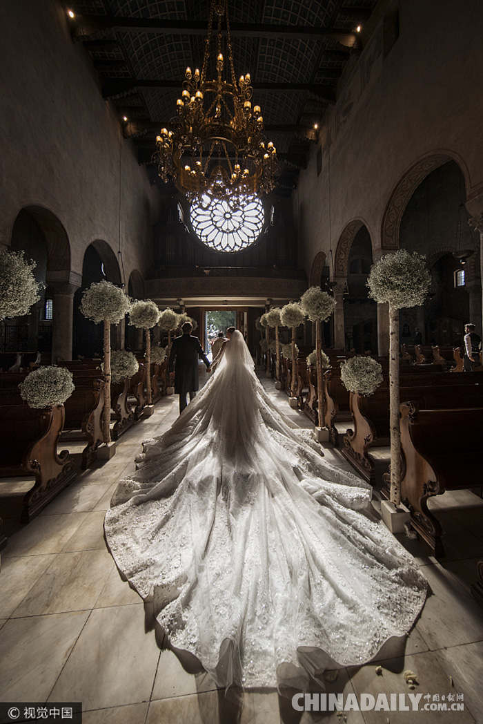 婚纱有迪拜著名设计师亲手打造,婚纱20英尺长的拖尾上装饰着满满的施华洛世奇水晶。(图片来源:视觉中国)