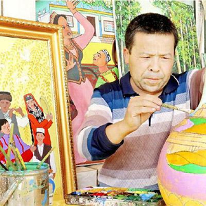 吐鲁洪今年45岁,擅长画画,他的葫芦画、版画、石头画和墙壁画远近闻名。他的画以维吾尔族农民的日常生活为题材,近年来,他更是将身边的民族团结事迹搬上了葫芦。