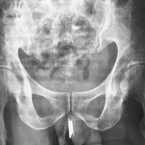 本报讯(华商晨报记者 王丽娜)一年多时间频繁尿血,沈阳35岁的男子求医无果后,到沈阳军区总医院泌尿男科就诊。 经过详细检查后,医生发现,男子的尿道内竟然有多达15根家用缝衣针。这些钢针都是男子自己在一年左右的时间内陆续放进去的。 医生提醒,尿道口异物患者并不少见,油笔芯、温度计、铁丝在临床上都看到过,但是这样做是非常危险的,严重了可能无法排尿,需要手术改道甚至终身残疾。 罕见病例: 男子尿道口内插15根缝衣针 6月20日15时许,沈阳军区总医院泌尿男科副主任医师曹志强开始了一台艰难的手术。 台上的患者是一名35岁的未婚男子,尿道内塞入了15根长短不一的缝衣针,最长的约8~10厘米,最短的也有5~6厘米长。 男子在家属的陪同下,最近因尿道疼痛不适多家医院就诊后,转到沈阳军区总医院院。拍片提示,针均卡在大概膜部尿道位置。 医生了解到,从一年多前开始,男子分多次由尿道外口塞入了钢针,均为针鼻儿一头向内、针尖向外,因此塞入时并没有很疼。 但钢针留在体内无法自行取出,时间长了,尿痛、尿血等问题让他难以忍受,只得多方求医。 如此多的尿道异物,传统的治法肯定是开刀取出,但患者却不希望开刀,因此跑了多家医院也没有治好。 为此,曹志强医生在泌尿男科主任刘龙的指导下,选择了电切镜、输尿管镜、腹腔镜多种器械的手术方案,通过几根导丝将器械从尿道口送入尿道,将钢针一点点“拔”了出来。 医生提醒: 癖好不是病但需注意安全 “手术大概做了一个半小时左右,结束的时候我的手都累得发抖了,满头是汗,确实不容易。”曹志强说,其实这样的患者,在男科并不算罕见。 曹志强表示,男科还曾接诊过尿道内塞油笔芯、温度计、铁丝等异物的患者,男女都有。“有学者称这种有特殊癖好的人为‘性怪癖’的一种,尿道疼痛刺激或摩擦刺激能够使他们获得一种满足感。” 医生表示,这并不能说是一种疾病,但在方法上确实需要注意安全至上。因为钢针、笔芯、温度计等异物一方面不够清洁,另一方面容易折断或者存在易伤人的尖锐端,极易对人体造成损伤。一旦异物卡在体内无法取出,还会造成尿道狭窄、尿漏等问题,最严重的将无法排尿。 钢针卡在尿道外口 |