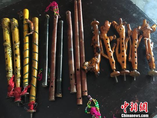 王建立自制的勒尤乐器。 王林成 摄