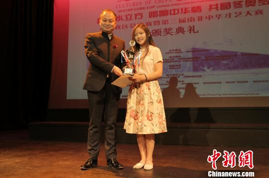 中国驻约翰内斯堡总领馆领侨室主任买欣全为获得第三届南非中华才艺大赛金奖的曹馨宇颁奖。 宋方灿 摄