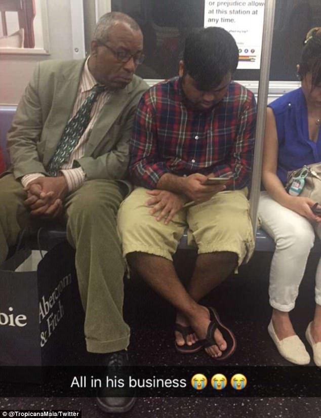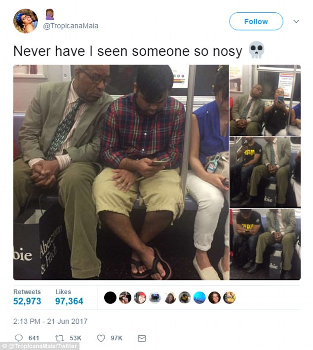 在地铁上,一些人有时会匆匆瞥一眼旁人的手机屏幕,这也无伤大雅。但是从玛雅上传的照片来看,这名不明身份的年长男子不只是看看邻座是不是在打“糖果粉碎传奇”(Candy Crush),而是全身倚靠上去想看清别人的手机内容,即使遭到阻止也没放弃。一个年轻男子在他第一次靠近时几乎要抓狂,然而他调整坐姿,也只是换来对方更加靠近,并且伸长脖子想看得更仔细些。玛雅写道:“我从未见过如此八卦之人。”