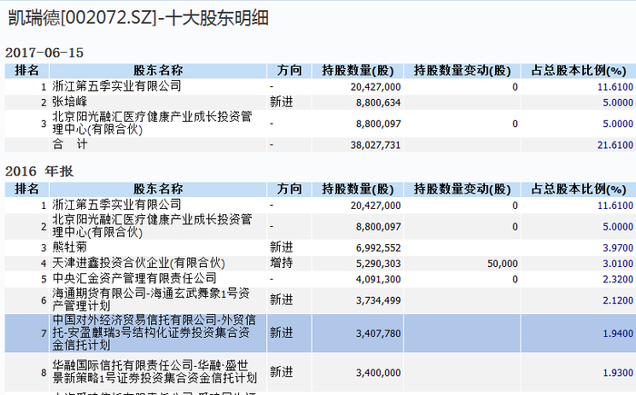另据证券时报报道,目前凯瑞德的实控人为吴联模,间接持有上市公司1.39%,但他控制的浙江第五季实业有限公司持有凯瑞德11.61%,是大股东。凯瑞德的董事长为张培峰,他通过不断收购股权,今年6月中旬已经持有凯瑞德总股本的5%。
