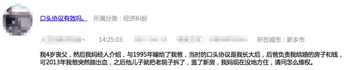 我4岁丧父,然后我妈经人介绍,与1995年嫁给了我爸,当时的口头协议是我长大后,后爸负责我结婚的房子和钱,可2013年我爸突然脑出血,之后他儿子就把老院子拆了,盖了新房,我妈现在没地方住,请问怎么维权?