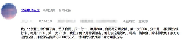 我在北京通过中介租了房,签了合同,押一付一,每月800,合同写分两次付,第一次8000,分十月,通过绑定银行卡,每月扣800,第二次300多。我住了俩个月需要搬走,他们说这是毁约,得赔三倍押金,除非得找到下家方可退我押金,押金保洁费共记2000元左右。请问我必须找到下家才可搬走吗?