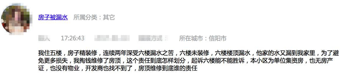 我住五楼,房子精装修,连续两年深受六楼漏水之苦。六楼未装修,六楼楼顶漏水,他家的水又漏到我家里。为了避免更多损失,我掏钱维修了房顶,这个责任到底怎样划分?起诉六楼能不能胜诉?本小区为单位集资房,也无房产证,也没有物业,开发商也找不到了,房顶维修到底是谁的责任?