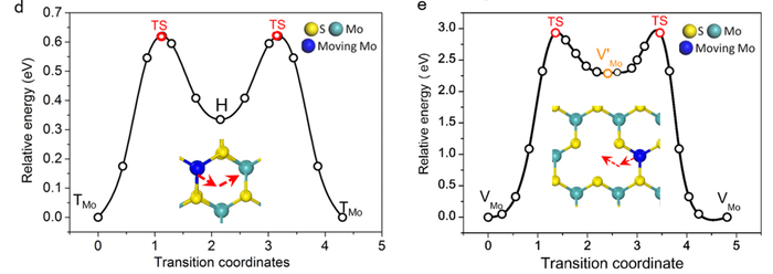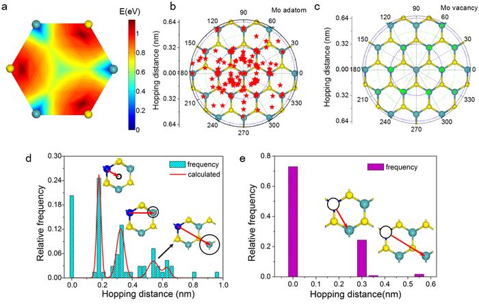 (图 (a)理论计算预测钼增原子在单层二硫化钼表面的等势能面图。图 (b)、(c)实验统计钼增原子及钼缺陷的停留位置分布。图 (d)、(e)理论计算得到的钼增原子及钼缺陷最可能的迁移路径及迁移势能图。)