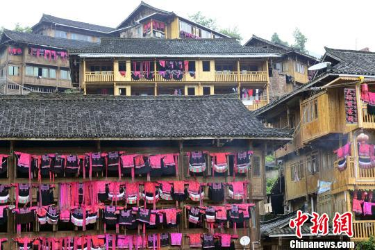 6月29日,广西龙胜各族自治县龙脊镇大寨村红瑶妇女在晒花衣。 吴生斌 摄