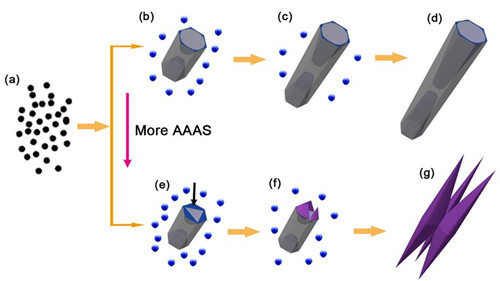 图2. 碲纳米管和三重结构的生长过程示意图:(a)初始阶段无定形Te;(b)纳米管初期;(c)纳米管中间期;(d)纳米管最终;(e)三重结构初期;(f)三重结构中间期;(g)三重结构最终。