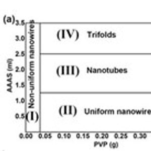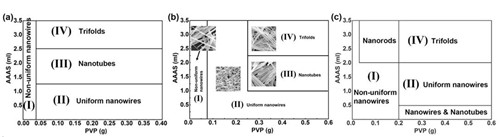 图1. 三种温度下产物形貌的演变图:(a) 120 °C;(b) 150 °C;(c) 180 °C;(I) 尺寸不均的纳米线;(II) 尺寸均一的纳米线;(III) 纳米管;(IV) 三重结构。