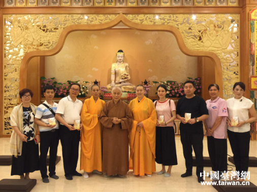 庹纯双一行在佛光山念佛堂体验佛教文化,图为堂主与全体成员合影。(中国台湾网发)
