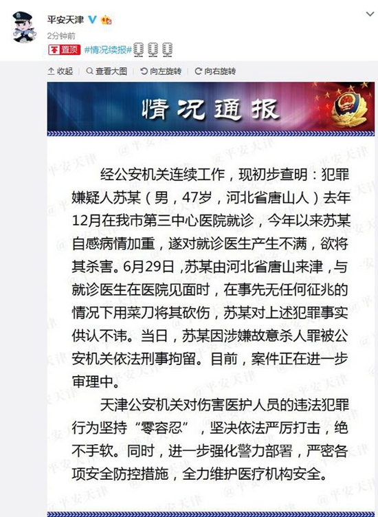 中新网7月1日电 据天津市公安局官方微博“平安天津”消息,6月29日,天津市第三中心医院发生恶性伤医事件,1名医生被菜刀砍伤,犯罪嫌疑人苏某因涉嫌故意杀人罪被公安机关依法刑事拘留,目前,案件正在进一步审理中。