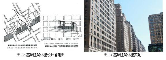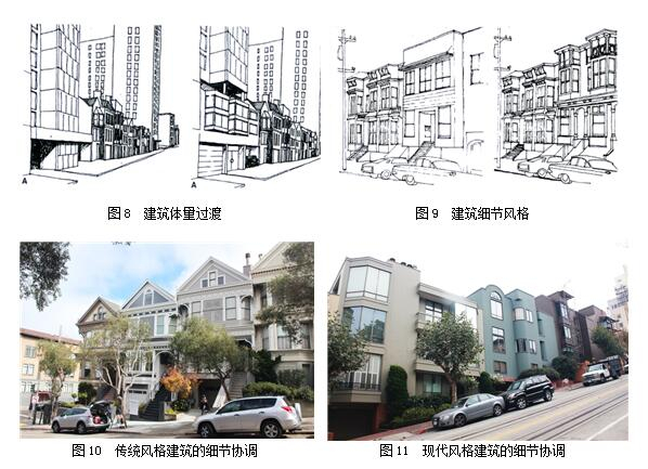 微观层面,旧金山城市设计从建筑细部控制和建筑体量控制两方面阐述了城市设计要求。在建筑细部控制中,该城市设计在建筑风格延续、体量统一等方面制定了一系列微观城市设计准则(图8、图9),指导形成了旧金山市区街道,尤其是在亲人的低层街道空间上统一协调的建筑风格和色彩(图10、图11)。在建筑体量控制方面,旧金山城市设计制定了详细的建筑体量控制导则(图12)。在建设中,高层建筑大多采用了顶部退台的设计(图13),形成以裙房统一为主的街道风貌和以顶部退台为主的仰视视线感受。